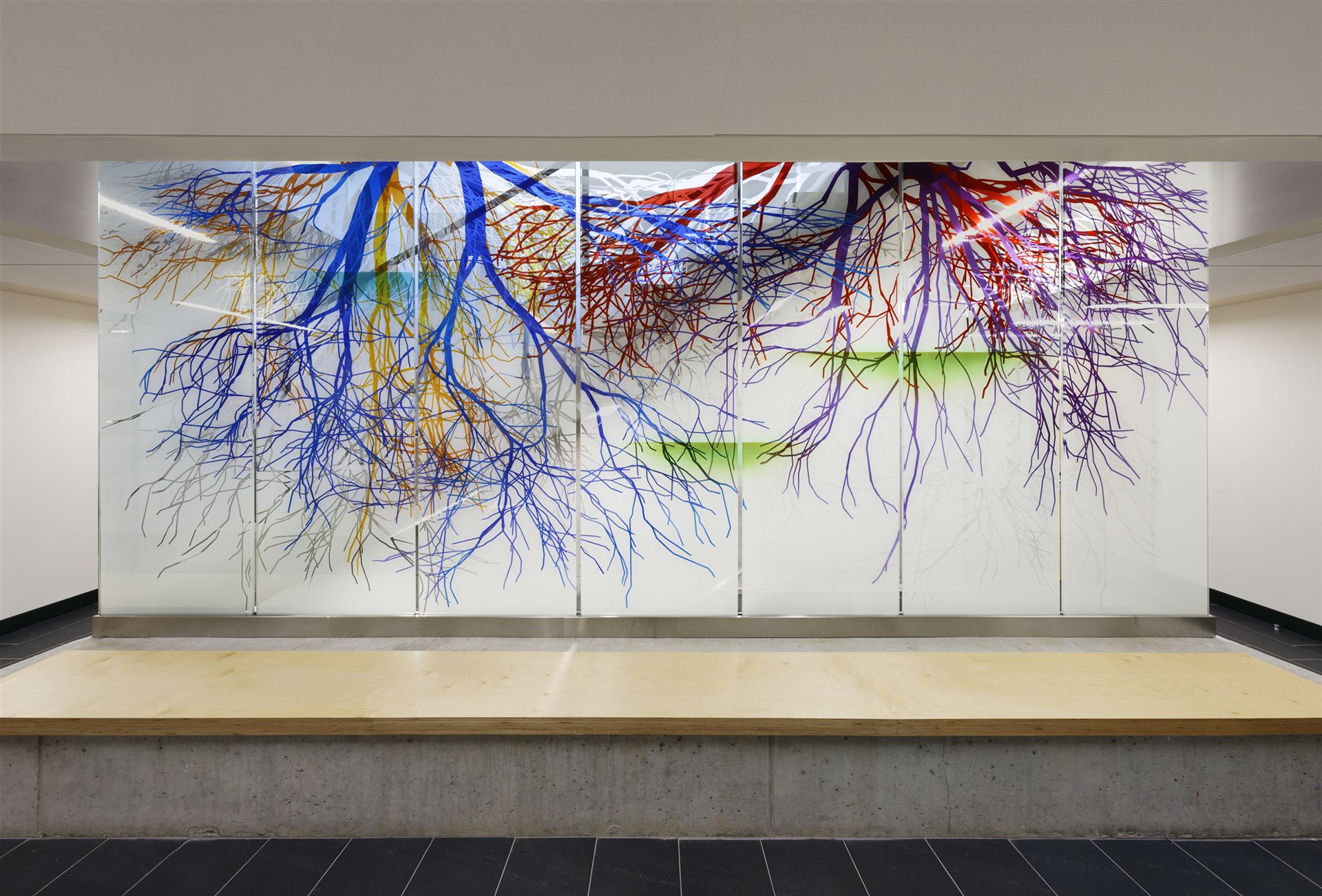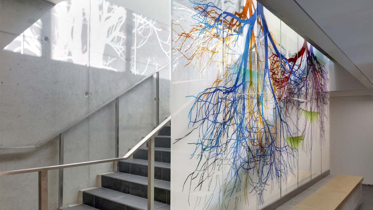 The richly colored root system celebrates the founders of the school. On each floor the viewer experiences the interplay of transparent, translucent and opaque glass – giving a sense of layered depth, and mystery.