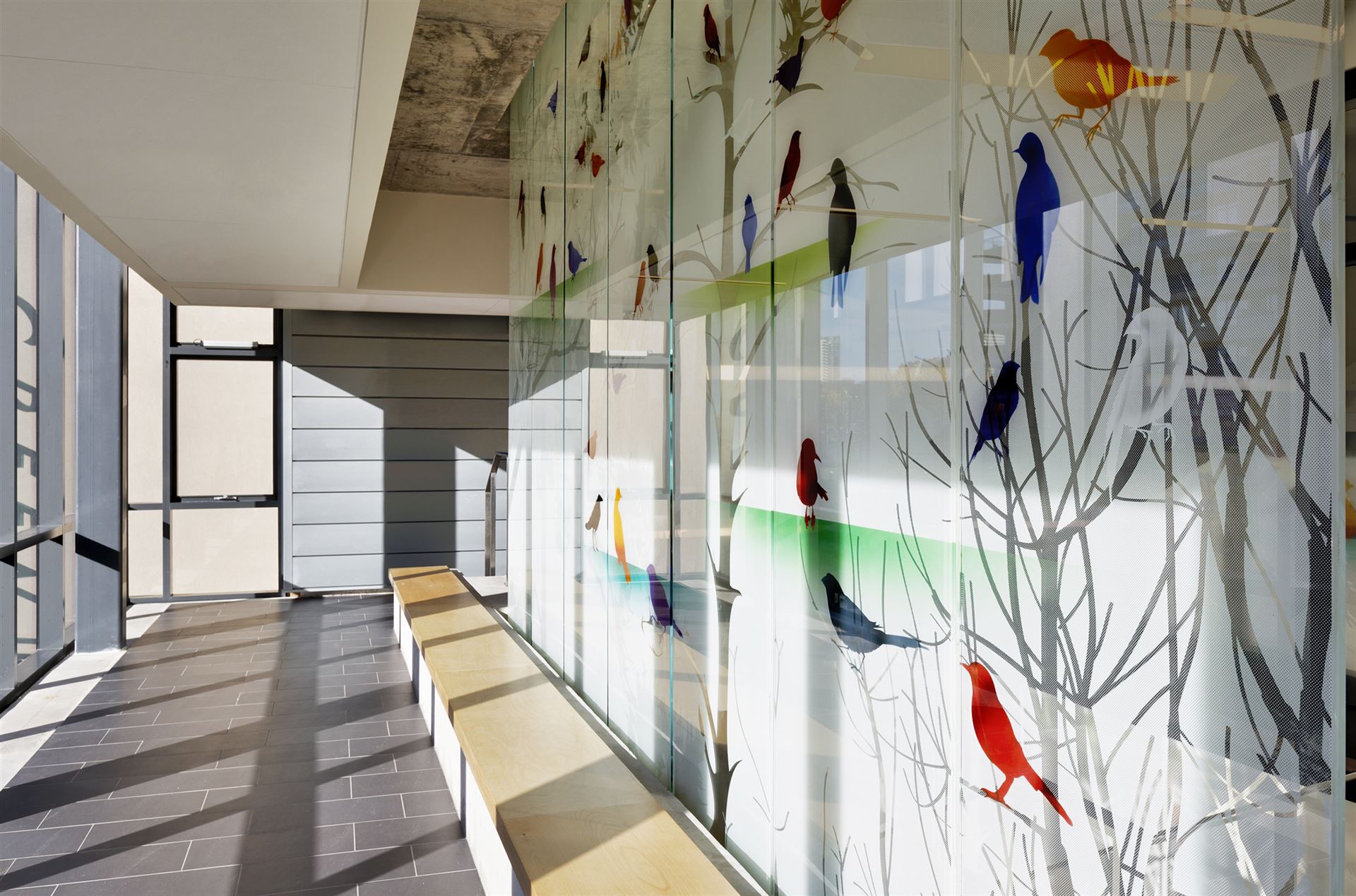 DESCRIPTION: “Singing the Light” is an integrated artwork 60 feet high by 18 feet wide continuously spanning five floors. The trees, root systems, eight spirit house colors, birds and light are an allegory for the school community. Sarah’s artwork uses stylized, dynamic and dramatic forms to contribute energy and vibrancy to the space. The trees speak to the role of the teachers and staff with their grounded outreach and sheltering branches. Moving around and through the branches are the birds in spirit house colors creating a connection to students.