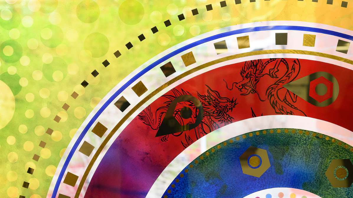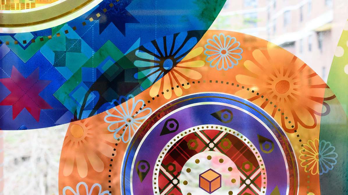 DESCRIPTION: In this artwork, the wheels on the bus symbolize the momentum of the diverse community. In the laminated glass, fabric patterns from over 20 different cultural groups are incorporated into the design to honor their traditions. The watercolor texture beneath them suggests emotions of people blending, finding connections.