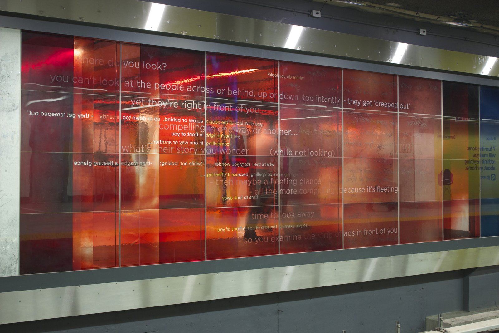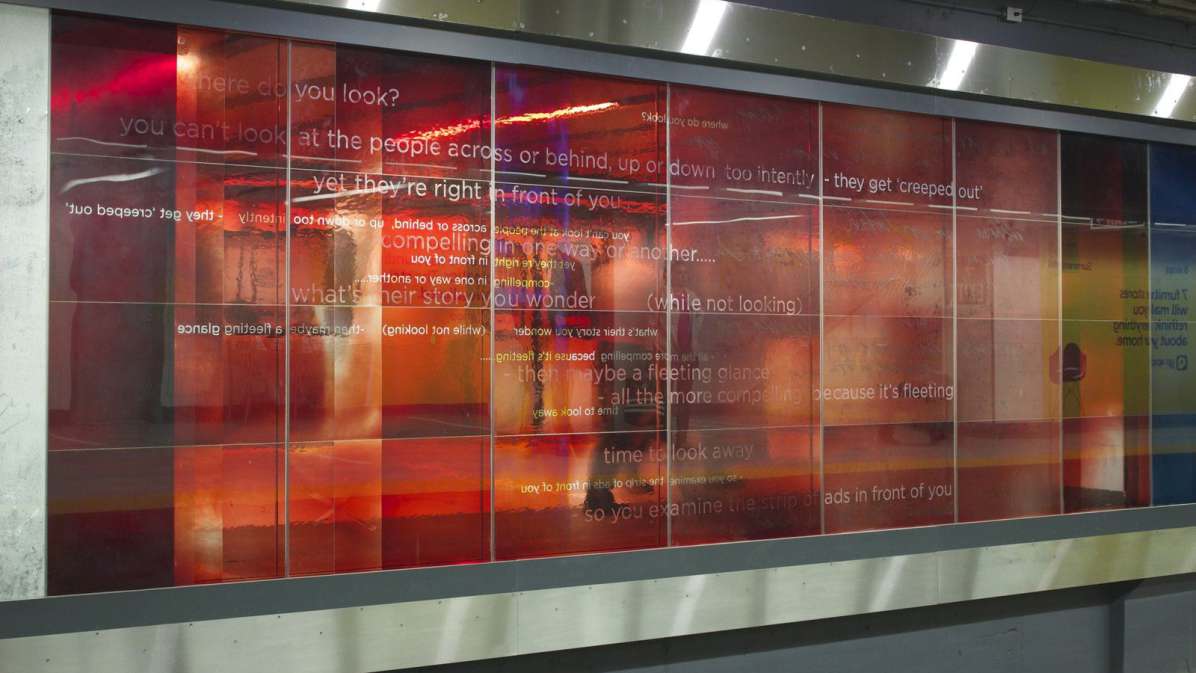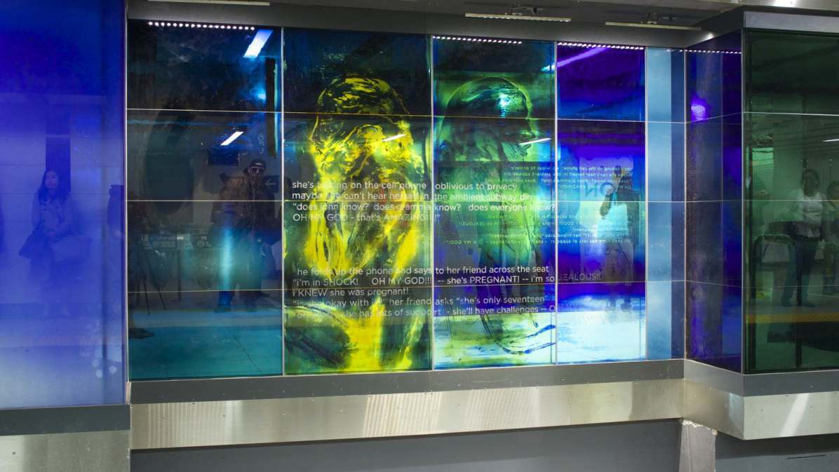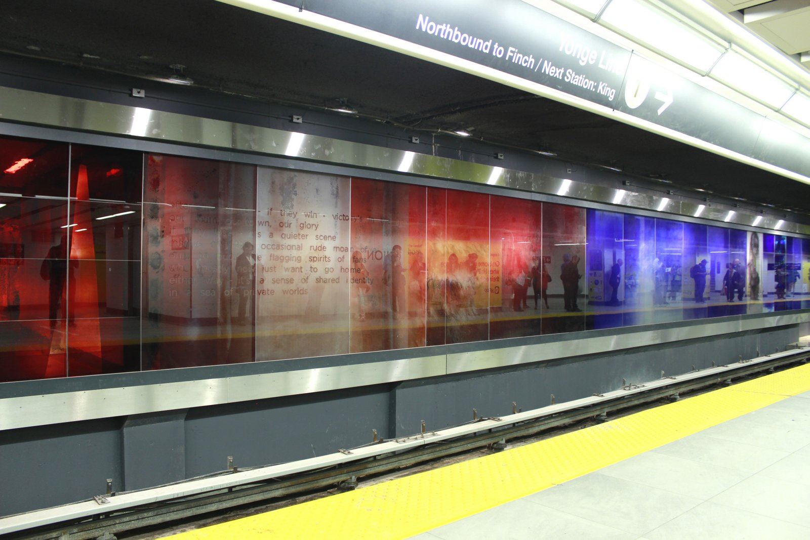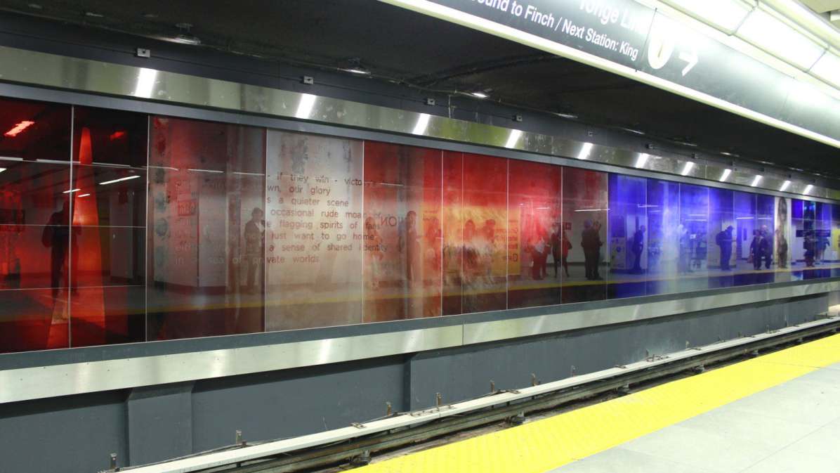 DESCRIPTION: "Zones of Immersion" is an epic, translucent/ transparent mural. Using imagery and text, the artwork captures the blurred, throbbing rhythms of a city in transit. The design responded to an international competition for Toronto’s Union Station revitalization, and sought to evoke the commuters’ lived experience. Possibly the largest permanent public art project in Toronto’s history, it runs the length of Union Station’s redesigned subway platform (7' x 500'). Glowing colors and monochrome portraits of commuters are either reflective or transparent, making the entire artwork both ribbon and veil.