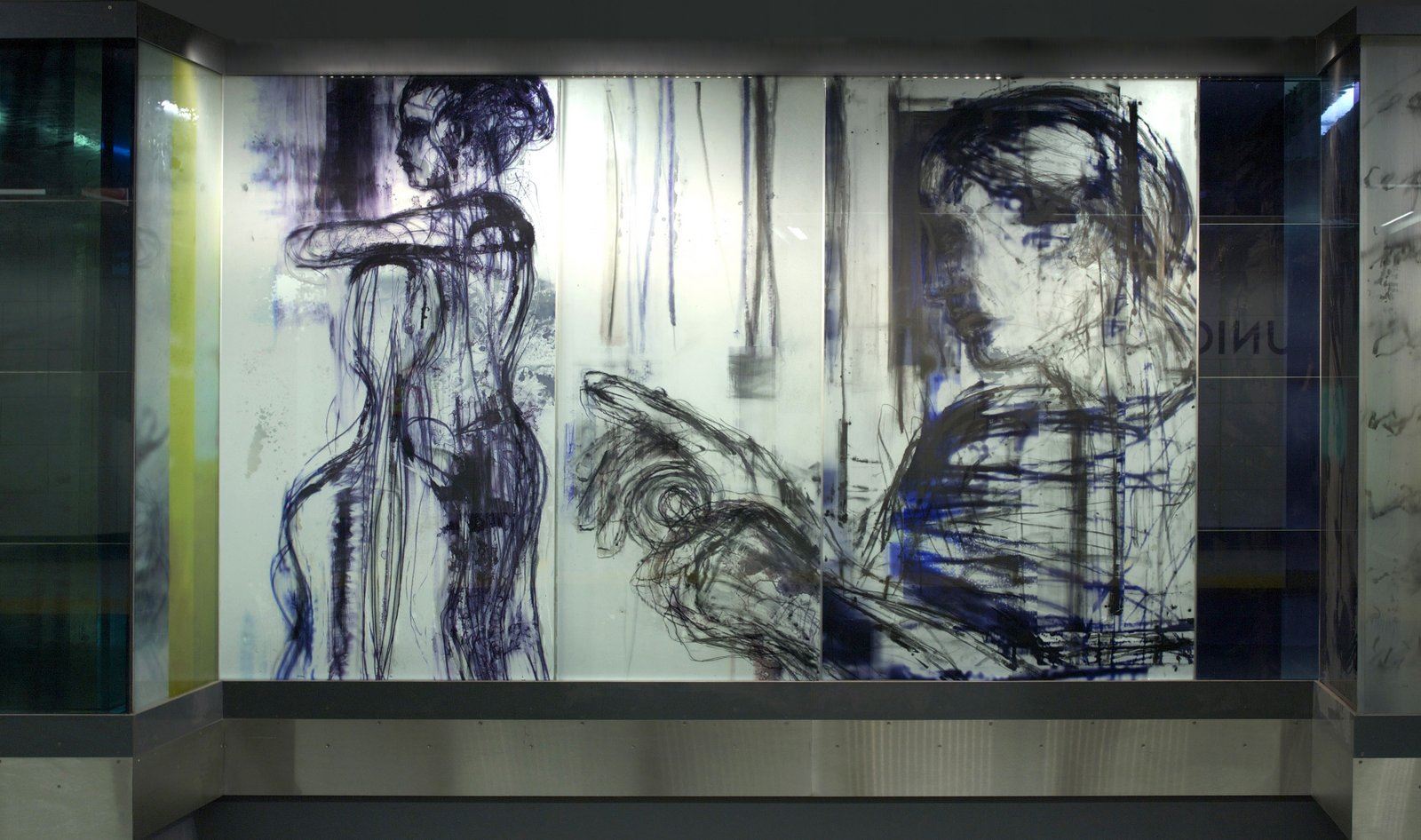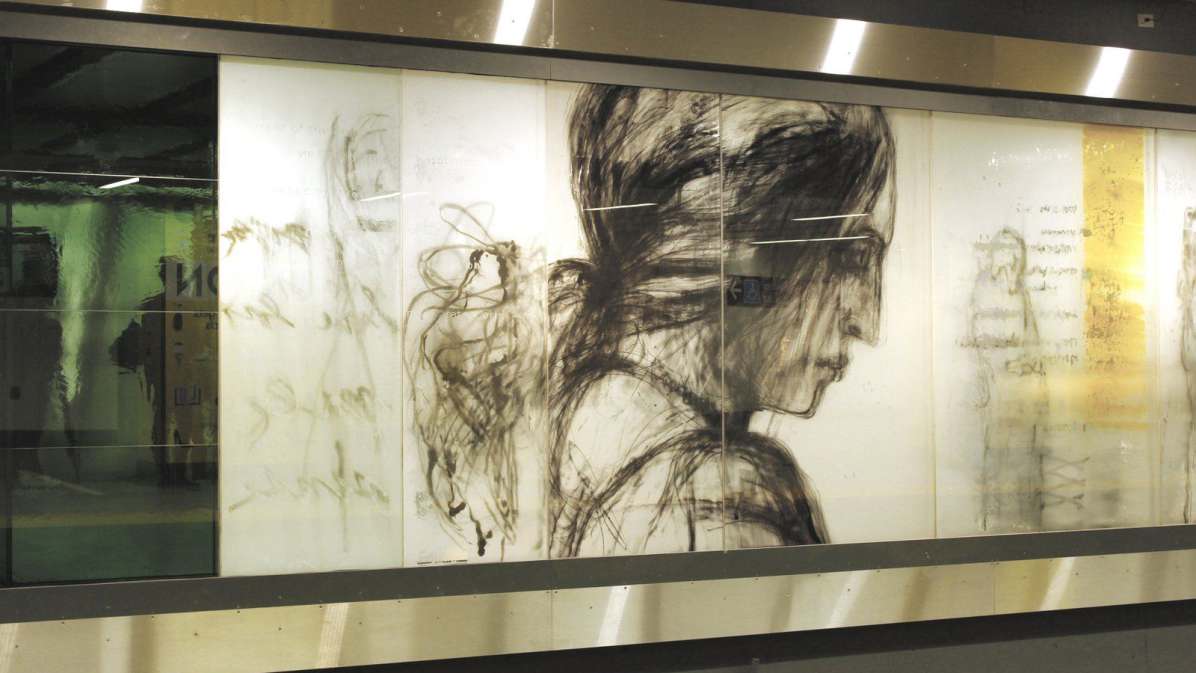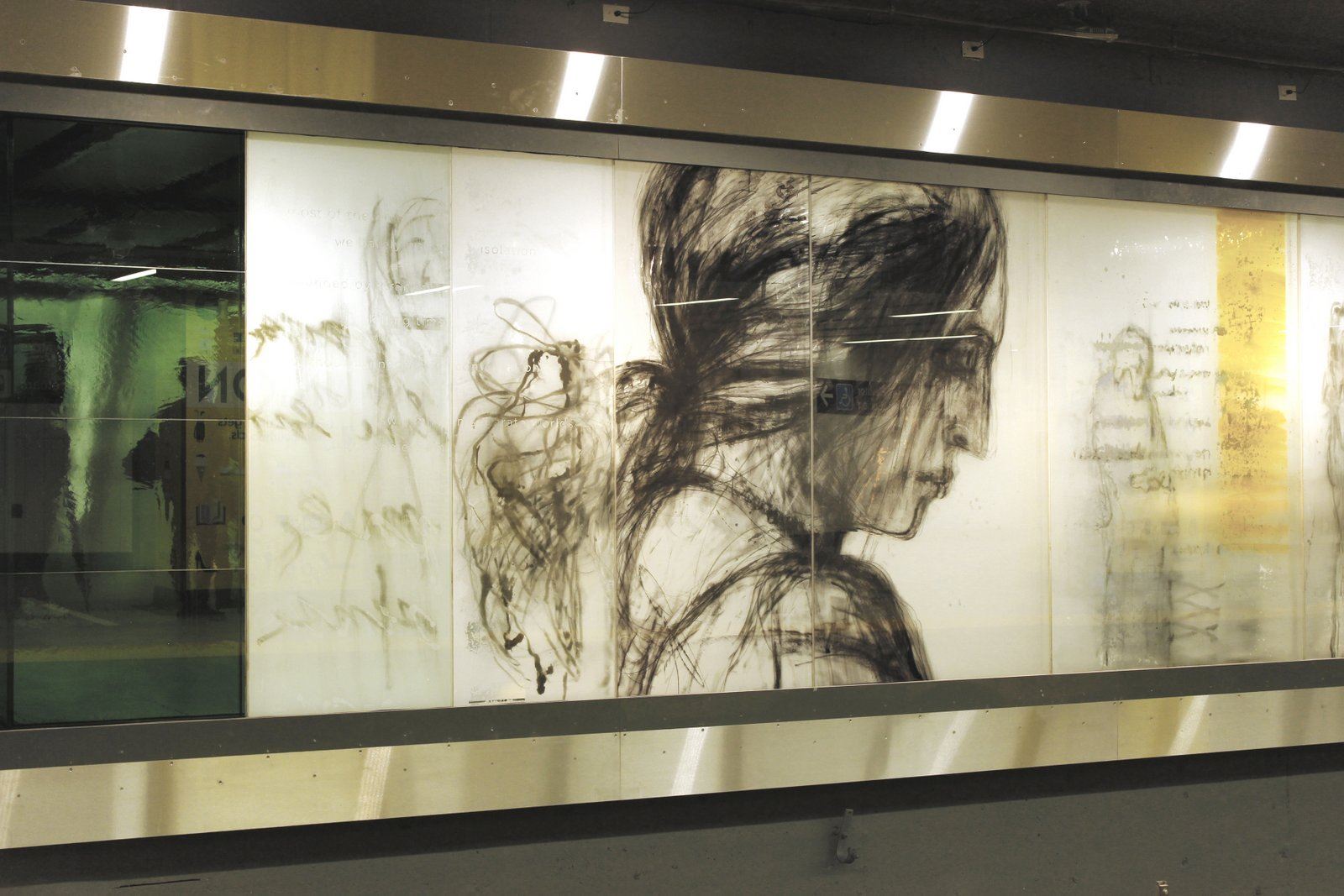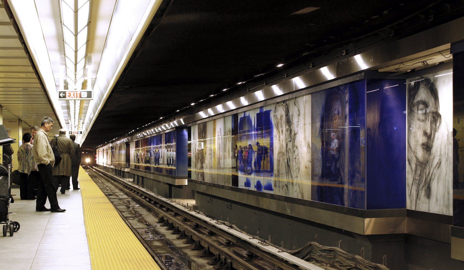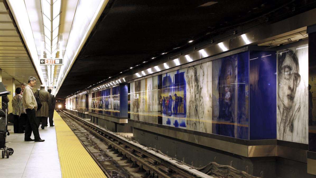 DESCRIPTION: "Zones of Immersion" is an epic, translucent/ transparent mural. Using imagery and text, the artwork captures the blurred, throbbing rhythms of a city in transit. The design responded to an international competition for Toronto’s Union Station revitalization, and sought to evoke the commuters’ lived experience. Possibly the largest permanent public art project in Toronto’s history, it runs the length of Union Station’s redesigned subway platform (7' x 500'). Glowing colors and monochrome portraits of commuters are either reflective or transparent, making the entire artwork both ribbon and veil.