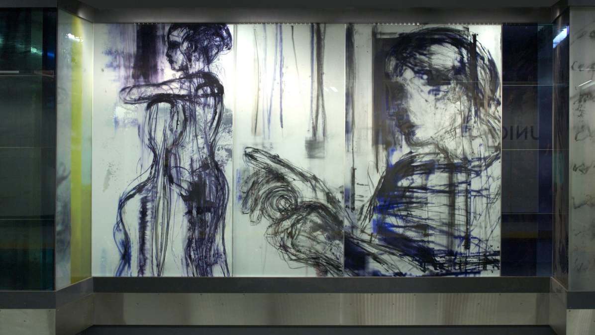 Technique: Silver-stained, enameled, acid-etched and laminated glass.