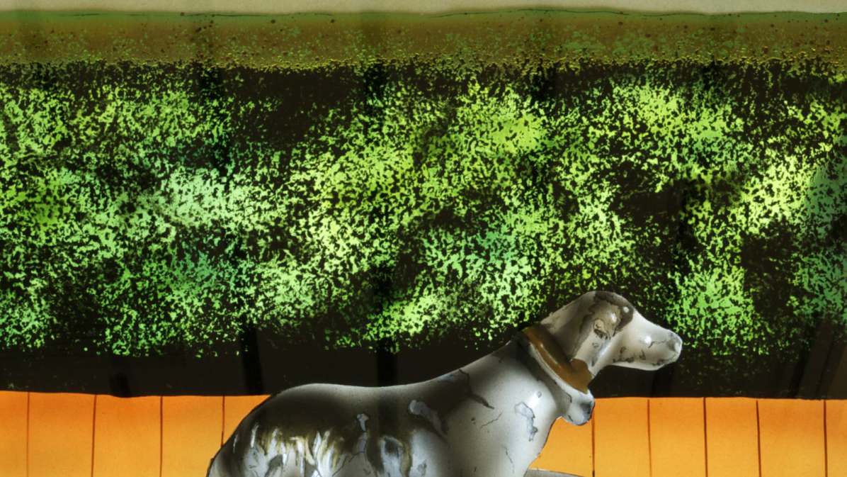 Technique: Hand-painted and airbrushed colored vitreous enamels applied to security glass.
