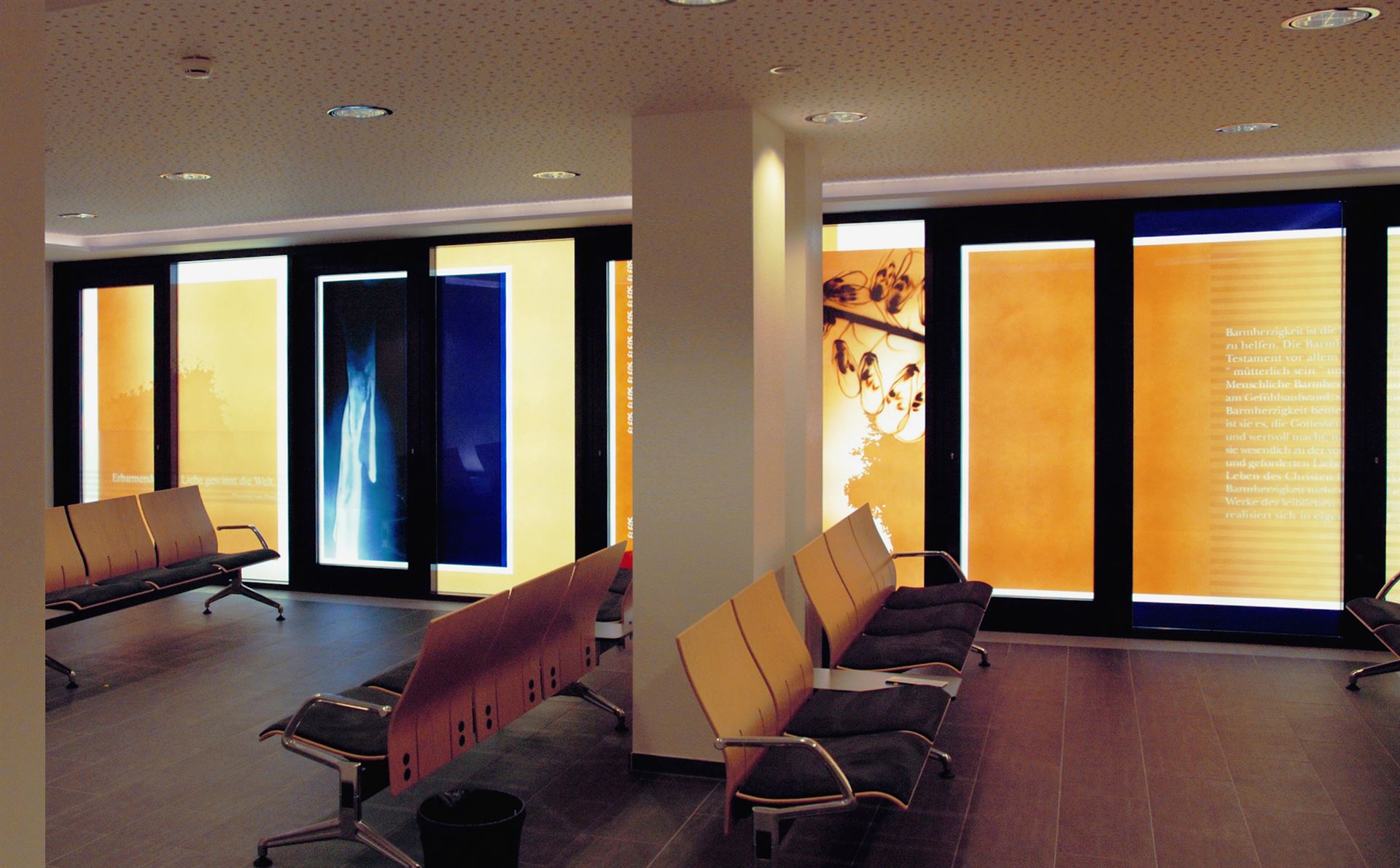 DESCRIPTION: St. Vincenz Hospital hospital went through and extensive remodel and redesign in 2005. As part of the redesign a once dark entrance and transition area was activated by the addition of backlit art glass panels which helped with lighten and open up the space. This interior transformation was directly aligned with the hospitals new exterior facade. The subject matter of the artwork reflects concepts of heart, healing and mercy that are directly connected to St. Vincent de Paul. The intention is to create an interplay architecture, function, and technology with aesthetic sensibilities. The goal was to promote a warm and positive feeling where one can pause and reflect.