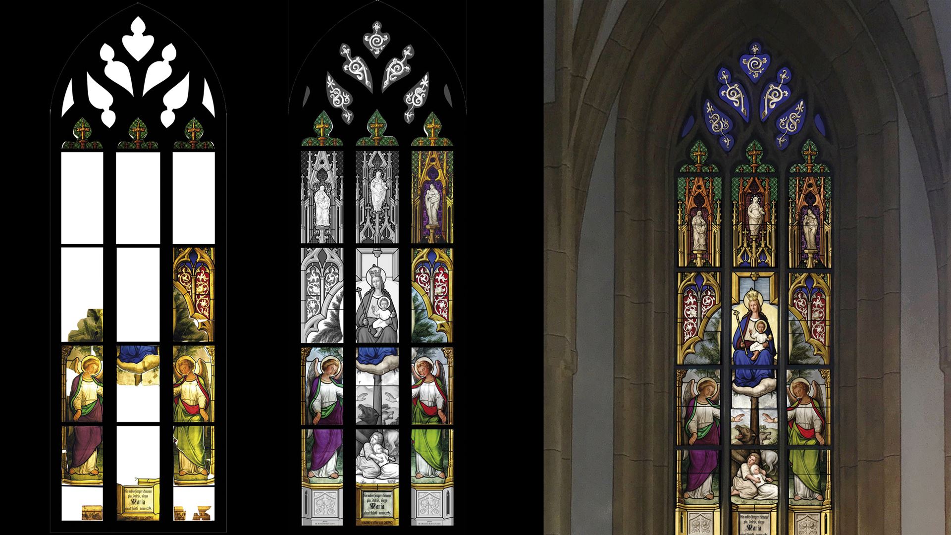 The archive documents that were compiled and the parallel search for the missing window fragments made it possible to produce a reconstruction drawing of the missing elements as a first step. The axial symmetry prevailing in parts of the window facilitated the reconstruction and provided certainty for the closure of the missing sections.